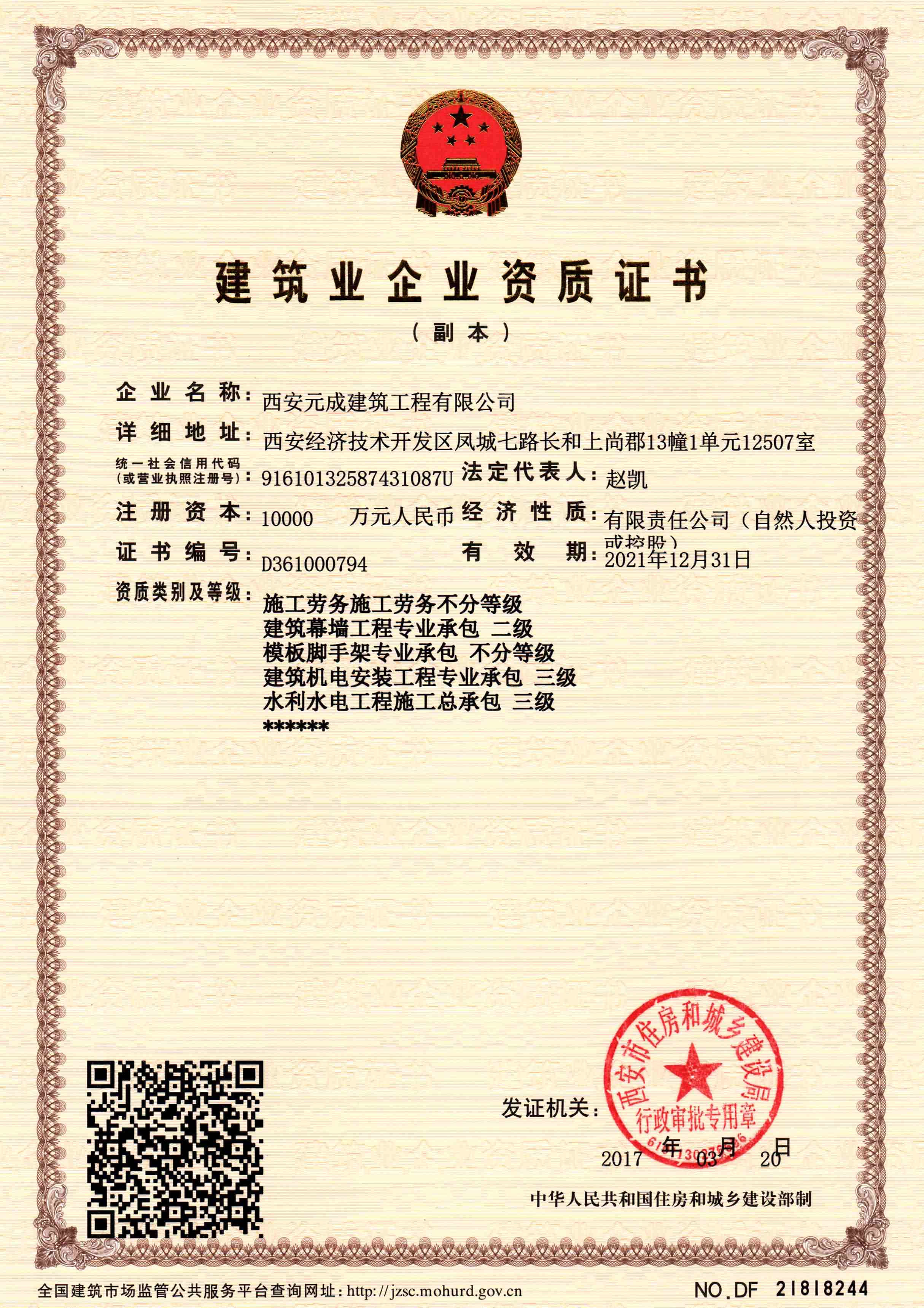 西安元成建筑工程有限公司成立于2012年,是一家擁有建筑工程、市政公用工程、石油化工工程、機電工程施工總承包貳級;鋼結(jié)構(gòu)工程、防水防腐保溫工程專業(yè)承包貳級;電力工程、水利水電工程施工總承包叁級;建筑機電安裝工程、輸變電工程、環(huán)保工程專業(yè)承包三級;模板腳手架專業(yè)承包、勞務(wù)分包等綜合性施工企業(yè)。